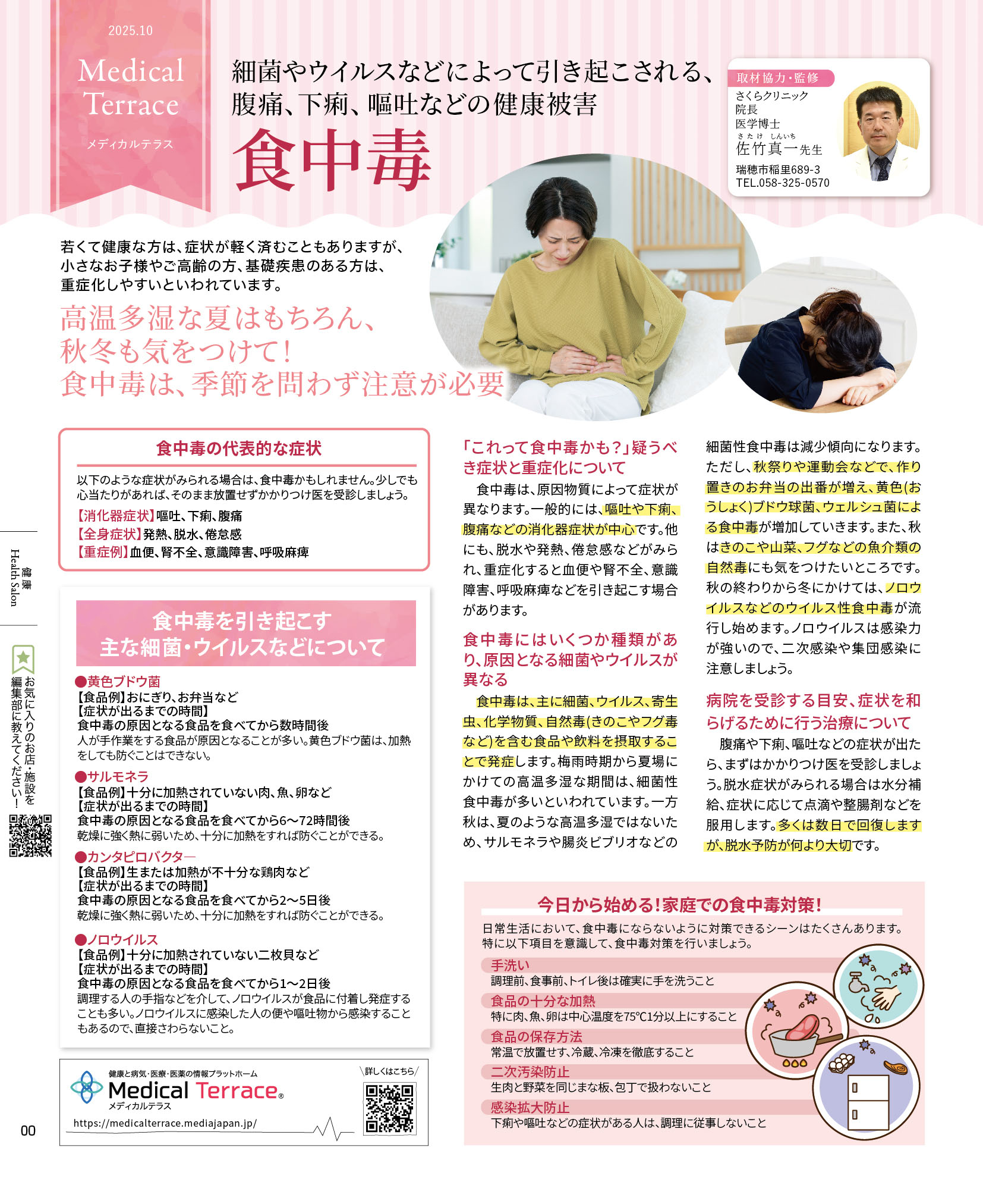 食中毒 SAKURA 2025年10月号 2025 10/21 食中毒(食あたり) 2025.10.21 SAKURA編集部_Mayuka.Y あわせて読みたい 細菌やウイルスなどによって引き起こされる、腹痛、下痢、嘔吐などの健康被害 食中毒 若くて健康な方は、症状が軽く済むこともありますが、小さなお子様やご高齢の方、基礎疾患のある方は、重症化しやすいといわれています。 食中毒(食あたり) 食中毒 さくらクリニック 佐竹真一 よかったらシェアしてね! URL Copied! URL Copied! マダニに注意! SAKURA 2025年9月号 関連記事 食中毒を予防する SAKURA 2022年8月号 2022.07.22 食中毒を予防する! SAKURA 2023年7月号 2023.06.22
