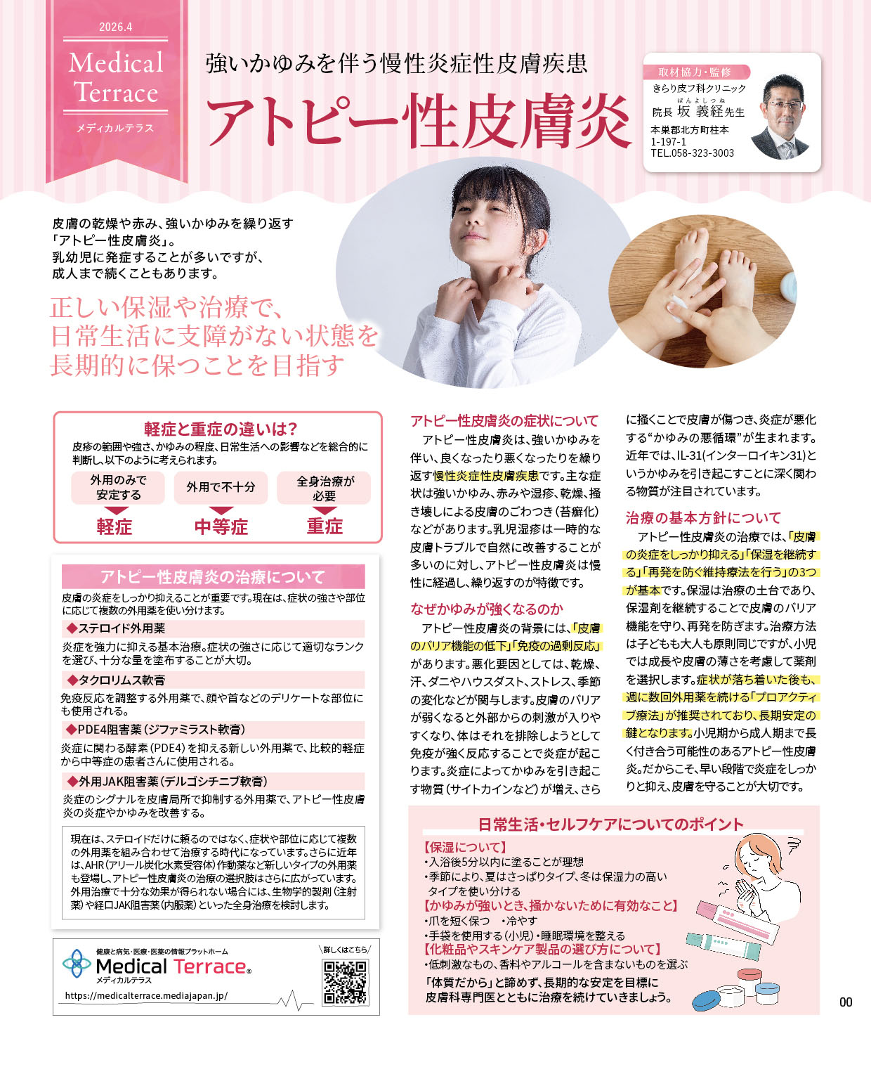 アトピー性皮膚炎 SAKURA 2026年4月号 2026 3/24 アトピー 免疫疾患 2026.03.24 2026.03.24 SAKURA編集部_Mayuka.Y あわせて読みたい 強いかゆみを伴う慢性炎症性皮膚疾患 アトピー性皮膚炎 皮膚の乾燥や赤み、強いかゆみを繰り返す「アトピー性皮膚炎」・乳幼児に発症することが多いですが、成人まで続くこともあります。 アトピー 免疫疾患 特集 きらり皮フ科クリニック 坂 義経 アトピー性皮膚炎 よかったらシェアしてね! URL Copied! URL Copied! 春の花粉症 SAKURA 2026年3月号 関連記事 春の花粉症 SAKURA 2026年3月号 2026.02.17 秋のアレルギー SAKURA 2024年10月号 2024.09.19 花粉症 講座2020 SAKURA 2020年2月号 2020.01.22 小児アレルギー SAKURA 2020年3月号 2020.02.22 アトピー性皮膚炎 SAKURA 2021年1月号 2020.12.22 春の花粉症 SAKURA 2022年2月号 2022.01.22 2023年 花粉症情報 SAKURA 2023年2月号 2023.01.22 子どもの花粉症 SAKURA 2024年2月号 2024.01.22
